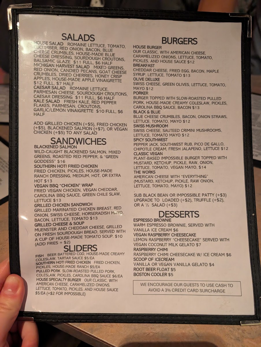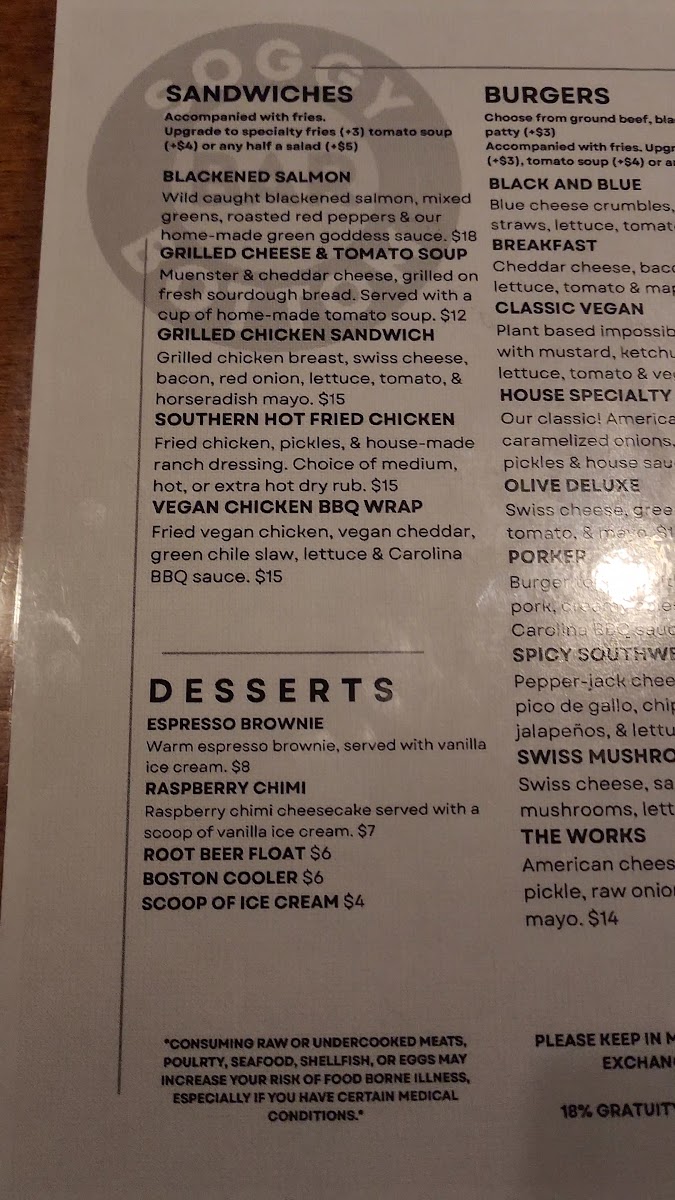 The menu at Soggy Bottom Bar features a variety of bar and grill offerings designed for casual dining experiences. It is structured to include appetizers, main dishes, sides, and an extensive selection of beverages ranging from soft drinks to alcoholic options.